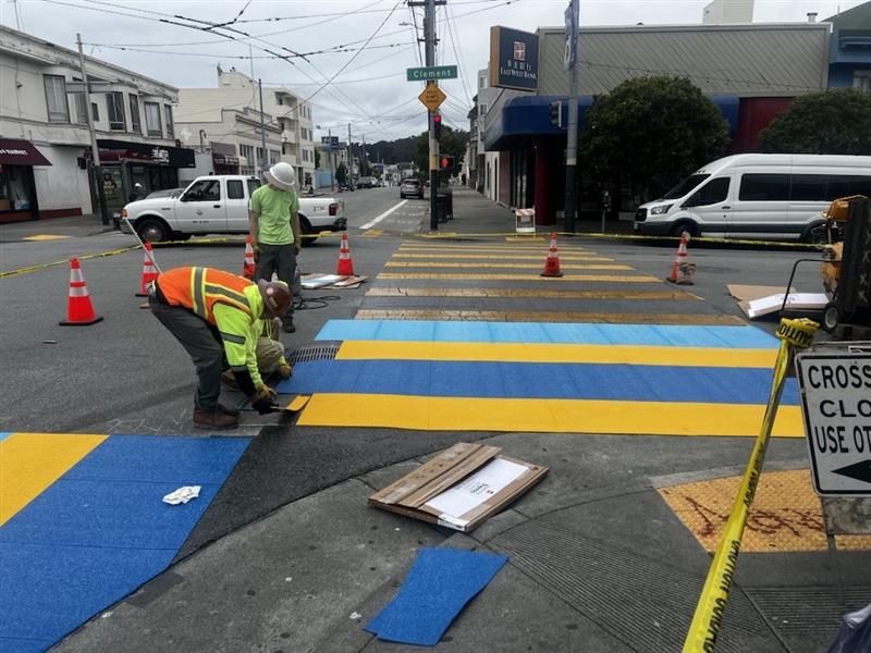 Clement Street is a bustling and vibrant corridor in the Richmond, with many restaurants, grocery stores, family-owned businesses, and more. This month, San Francisco Public Works completed installing new high-visibility, colorful crosswalks along the Clement Street and Sixth Avenue intersection.