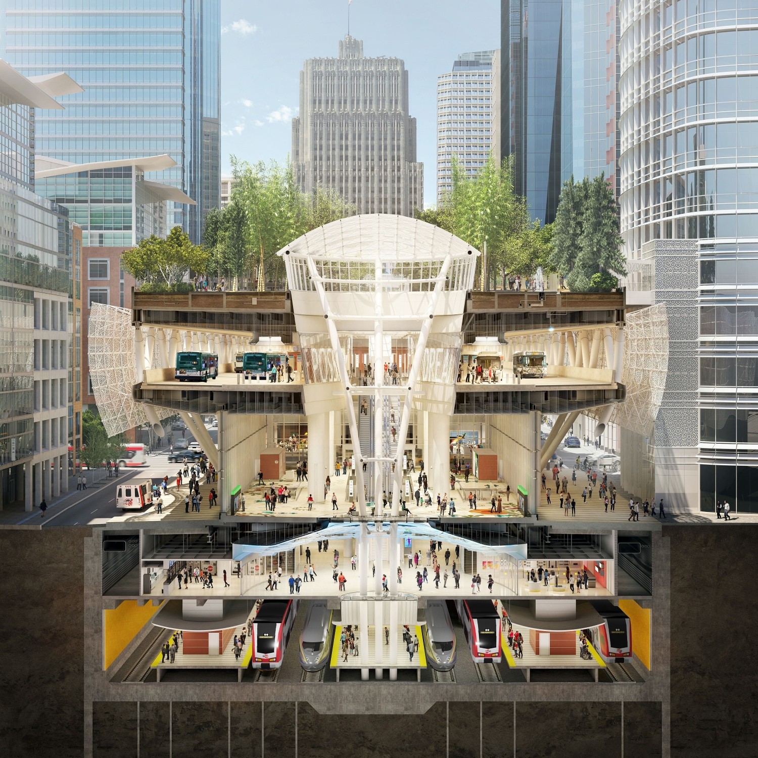 The multi-level building features a rooftop public park, service for multiple bus systems, art installations, retail shops, restaurants, a gym, and more.
