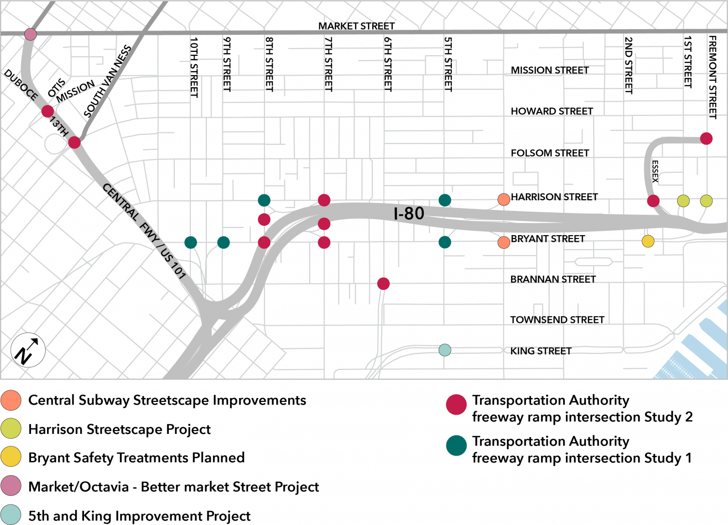 There are 22 intersections in SoMa where freeway on- or off-ramps intersect city streets. This map shows relevant projects and plans at each of these intersections. The Transportation Authority worked to improve safety at 15 of these intersections. The remaining seven intersections are part of planning efforts led by other local agencies.